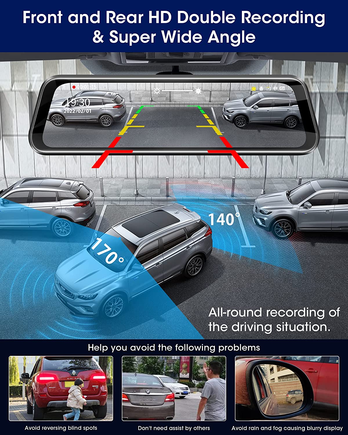 🚘10 inch IPS Full HD Touch Screen】Advanced mirror dashcam equipped with dual-lens, front and rear camera providing double protection for your safety. Adopts Full HD resolution of 1080P, which can record more vivid videos. The front camera is 1080p (3840x2160P), which captures the road ahead in detail and license plates clearly displayed on the big 10” IPS screen. The rear camera is 1080p coupled with WDR large aperture, to record and capture every moment clearly even in low light situation.