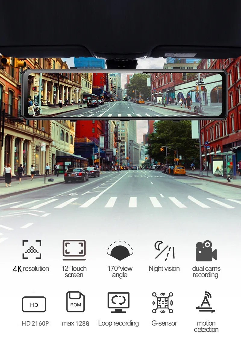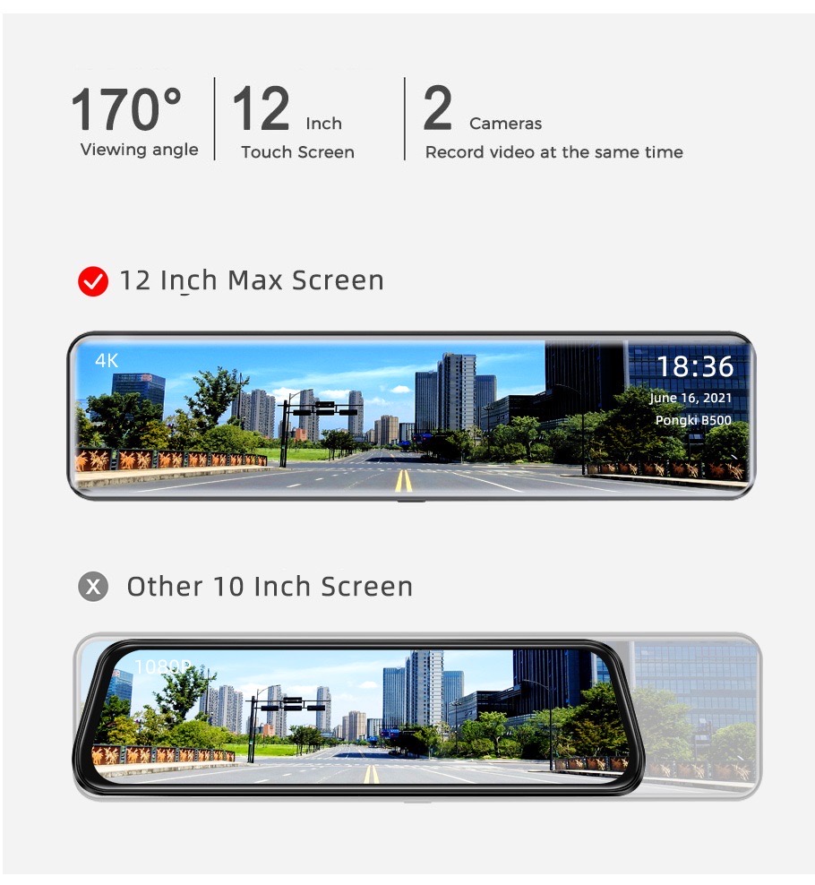 🚘【12 inch IPS UHD Touch Screen 4K Mirror Dash Cam】 The 12 inch mirror dash cam equipped with dual lens, 4K Front, 1080p Rear camera providing high quality double protection for your safety. Full UHD resolution of 4K*2K (3840*2160P), more vivid videos. The front camera is UHD 4K, which can capture the road ahead in more detail and license plates clearly displayed on the big 12” screen. The rear camera is 1080p coupled with WDR large aperture allows to record clearly even in low light situations.