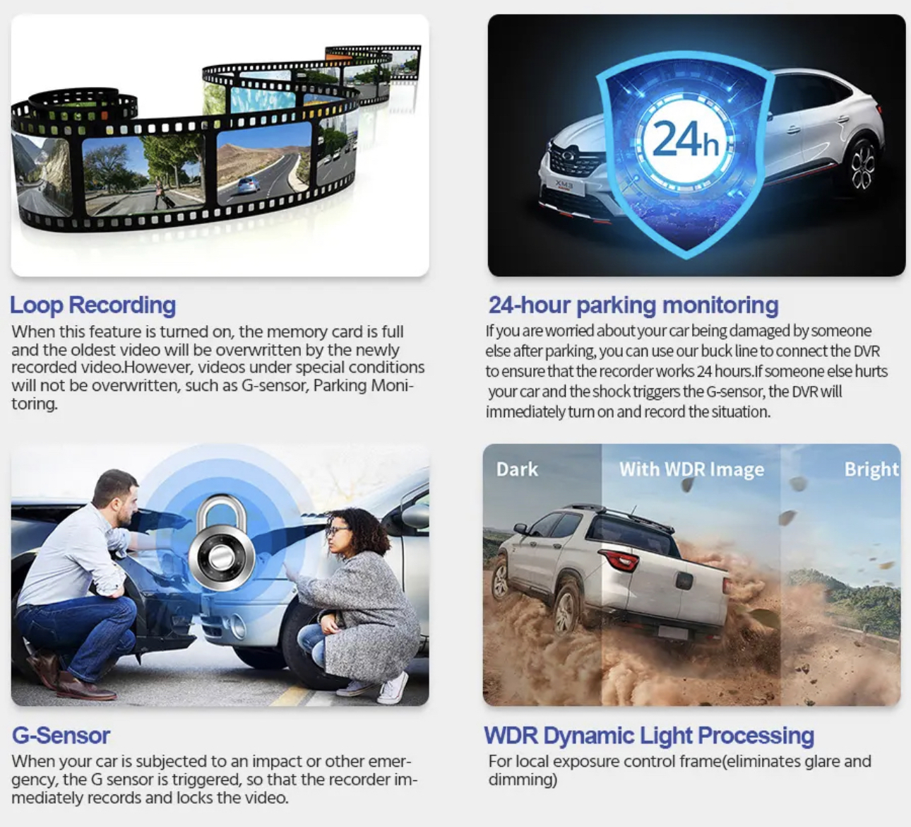 🚘【Loop Recording, Parking Guard】The built-in G-Sensor of the dashcam for car can automatically detect sudden shake/collision and lock the footage to prevent the video from being overwritten even in loop recording. The dash cam will turn on and automatically start recording for 30 seconds video once detecting external force when the engine is off and then turn off automatically. It can monitor all day, if you want to turn on the 24-hour parking mode, you must connect the hardwire kit, included.